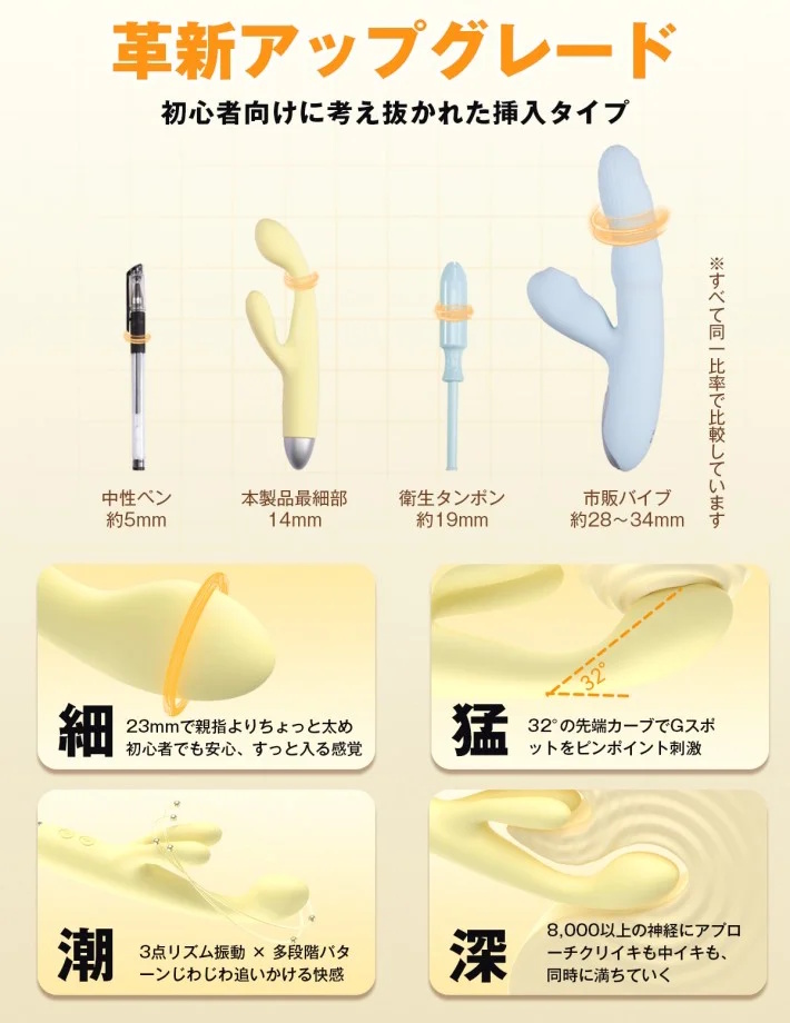 - 親指より少し太い程度の約23mmの太さなので、初めての人でも無理なく挿入できます。